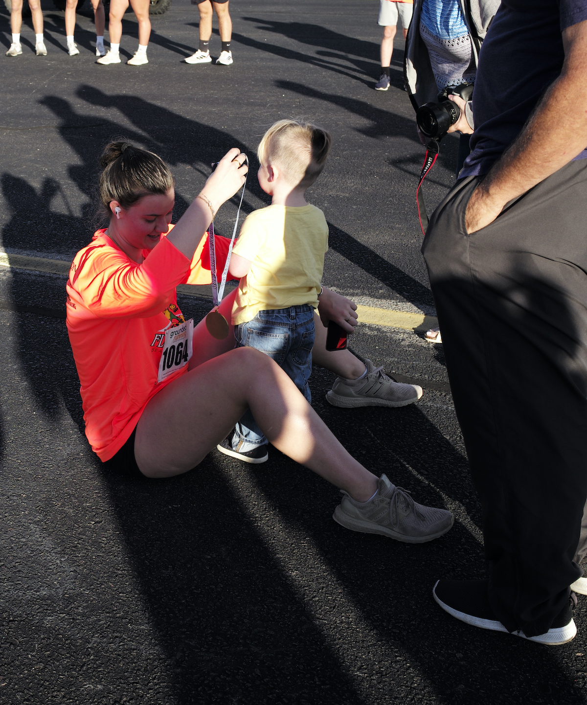 Abby Bosier, 18, of Greenville, showed the medal she earned for completing the the Flying Frog 5K on Saturday, Oct. 12, at the Beaufort County Executive Airport in 33:08.8 to her nephew, Bryce Bosier. Everyone who participated received a medal. Asa Aarons/The Island News