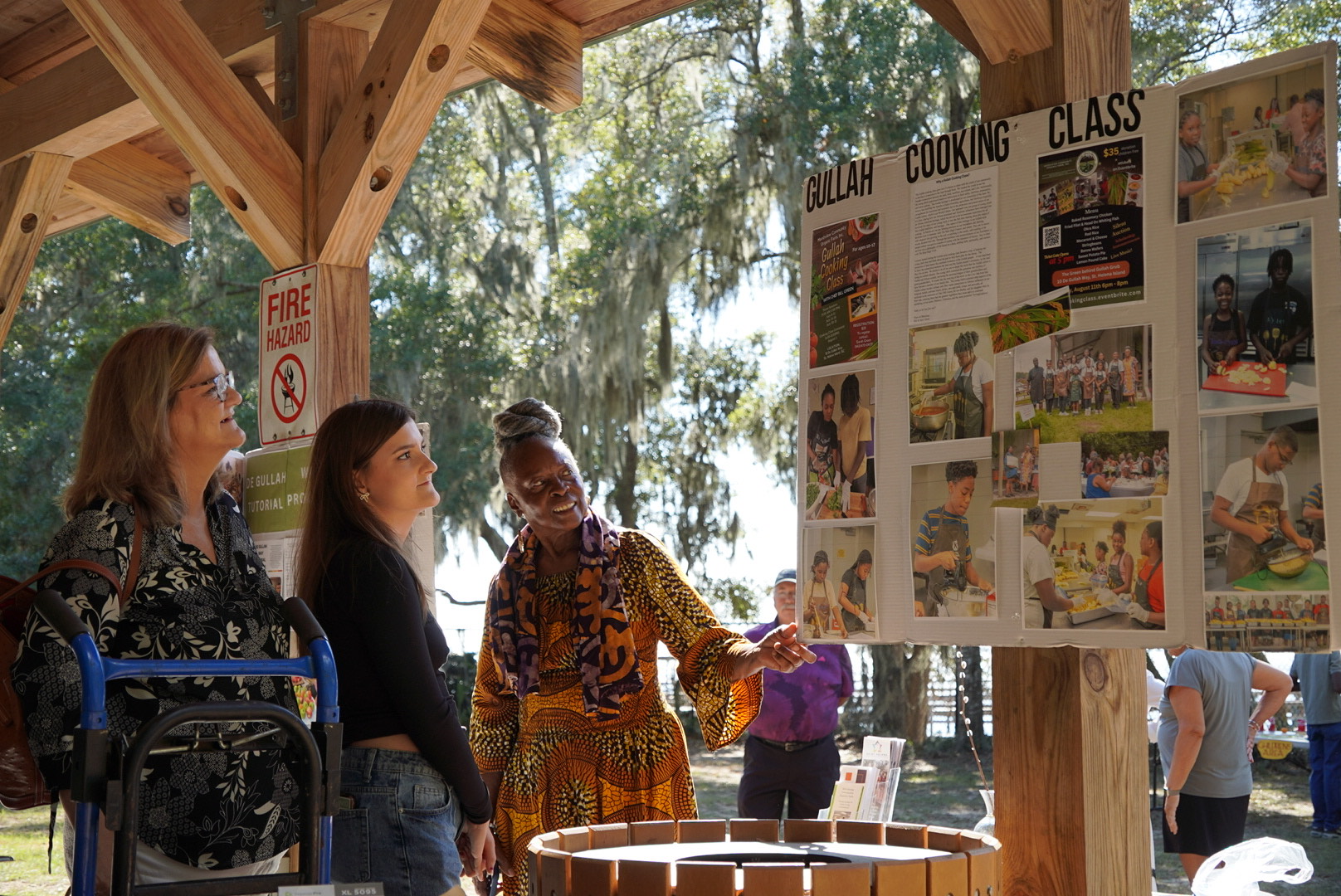Sara Reynolds Green, owner of Marshview Community Organic Farm, discusses the Marshview cooking classes with Ellen and Roslyn Cleary, both of Beaufort, during the Fort Fremont Fall Festival on Sunday, Nov. 3, 2024. Amber Hewitt/The Island News