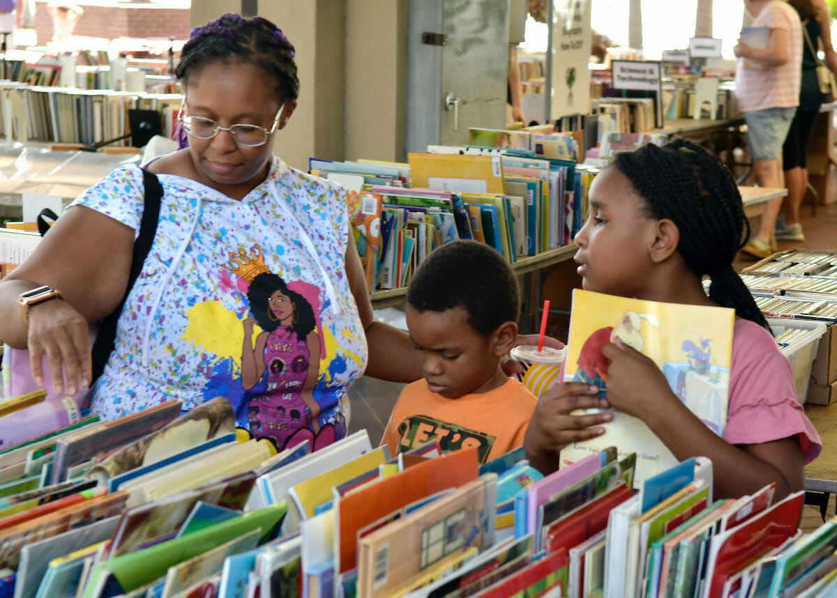 Michelle Latimore, left, helps her two children Cornelious, 6, and Amaya, 8, sort through some of the 20,000 books available for purchase during the 40th annual Friends of Beaufort County Library Book Sale on Saturday at Henry C. Chambers Waterfront Park. Bad weather took a toll on last year’s sale but Saturday’s weather was picture perfect. Volunteer Deb Chevas said thanks to “some very generous buyers” and the help of 150 volunteers, they should surpass that number. Chevas said that 100% of the money raised goes back into the library system, including its many branches and both bookmobiles.