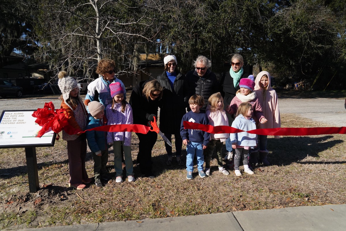 Beaufort County Library Director Amanda Brewer Dickman, with the assistance of several children, cuts the Story Walk ribbon on Saturday, Jan. 20, at the trail head of the Spanish Moss Trail.
