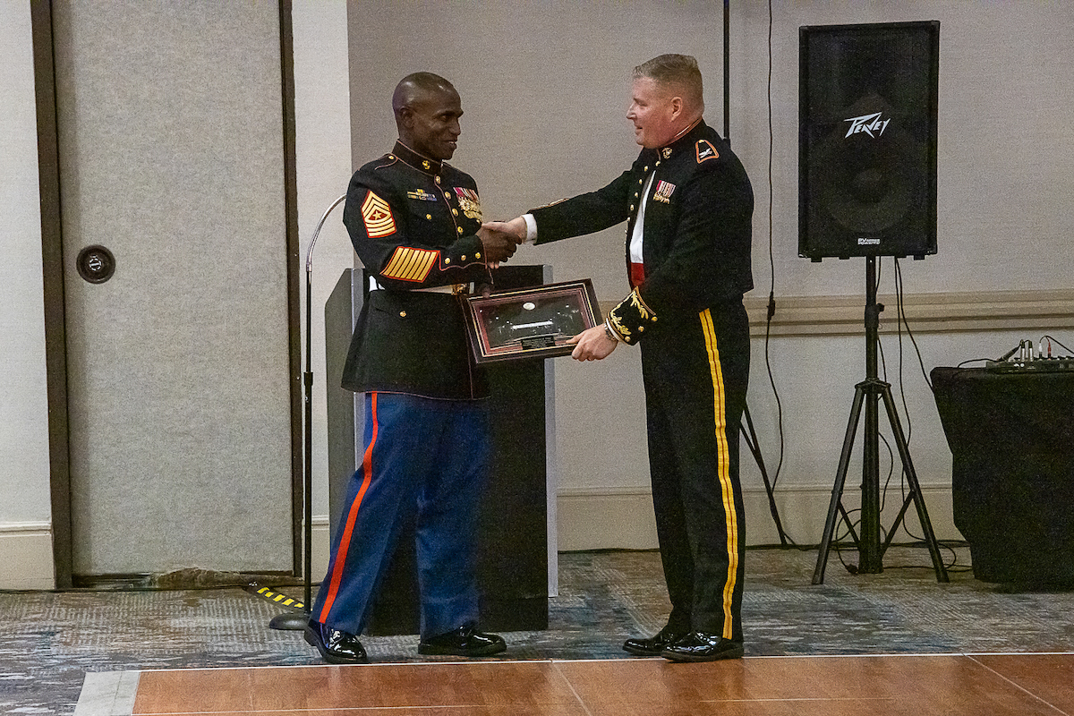 U.S. Marine Corps Col. Matthew D. Bain, commanding officer of Headquarters and Service Battalion, Marine Corps Recruit Depot Parris Island, presents a gift to Sgt. Maj. Anthony N. Page, the guest of honor, on Sunday, Nov. 1, 2024, during the 249th Marine Corps Ball at Hilton Head Island, S.C. The Marine Corps birthday ceremony honors the history, legacy and traditions passed down from generation to generation since the founding of the Marine Corps on Nov. 10, 1775. Cpl. Tanner Pittard/USMC