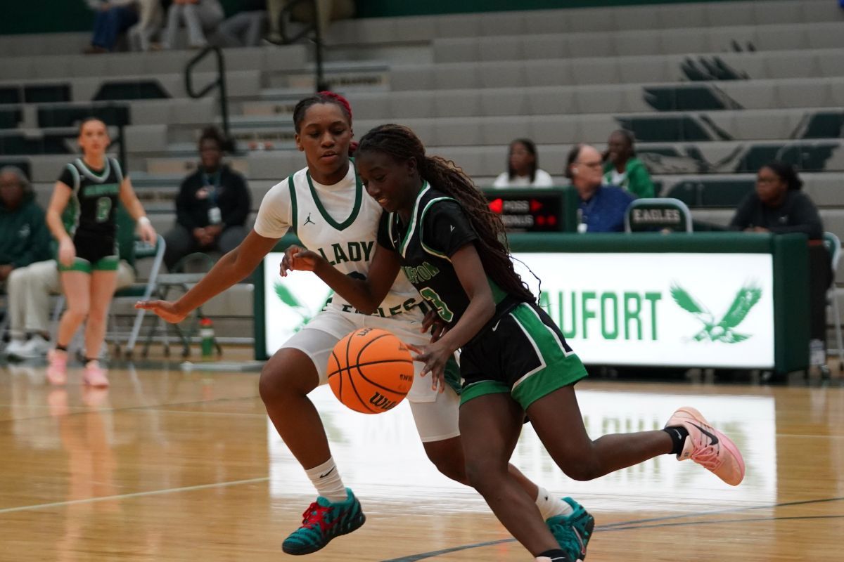 Beaufort High’s Jania Hayward guards the Bluffton ballhandler at Beaufort High on Tuesday, Jan. 20, 2026. Amber Hewitt/The Island News