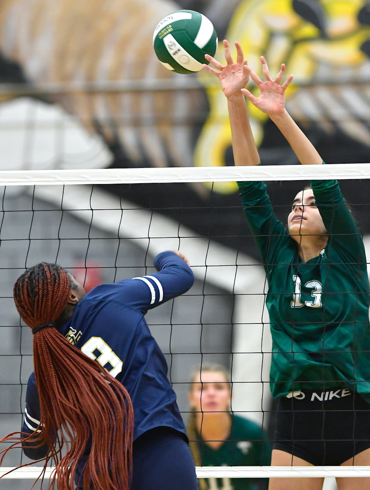 Beaufort HIgh School’s Olivia Byrne, right, just misses the block of Battery Creek’s Samyah Legree’s return on Thursday at Beaufort High. The host Eagles went on to win, 3-2. Bob Sofaly/The Island News