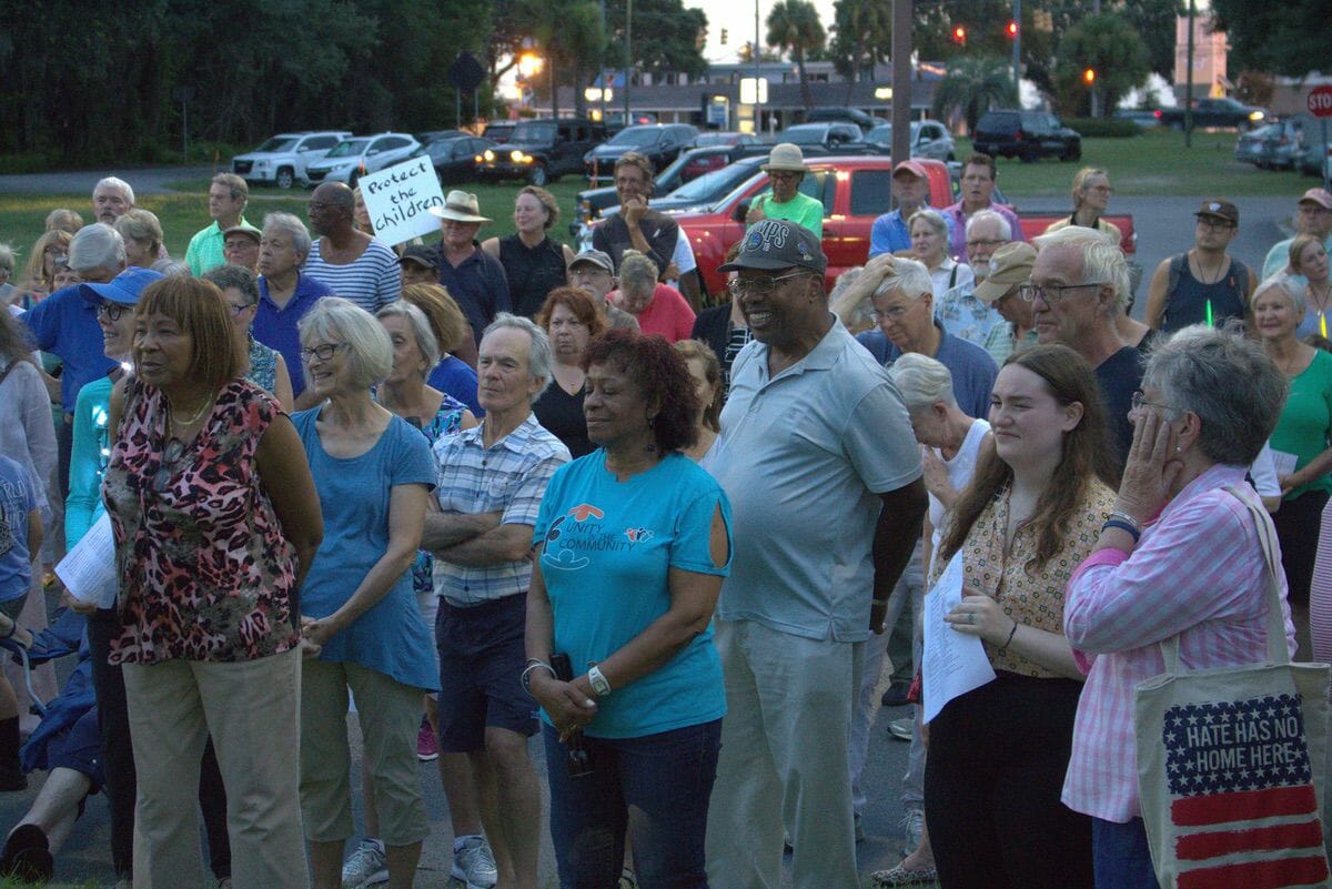 Speakers included George Kanuck from Lowcountry Immigration Coalition, Pastor Roy Tripp from St. Mark’s Episcopal Church Port Royal, and Rabbi TZiPi Radonsky. A march followed with participants shining flashlights and cellphones in a demonstration of solidarity and sympathy for those suffering in U.S. immigration camps.