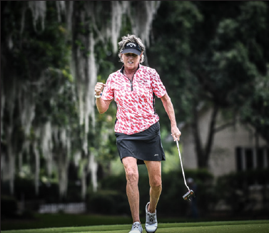 Moss Creek resident and 13-time LPGA Tour winner Rosie Jones gives a fist pump to the gallery after draining a long birdie putt on the par-4 16th hole during the LPGA Legends Tour event at Moss Creek’s Devil’s Elbow South course on Friday. Jones finished in a tie for third at 1-over-par 73.