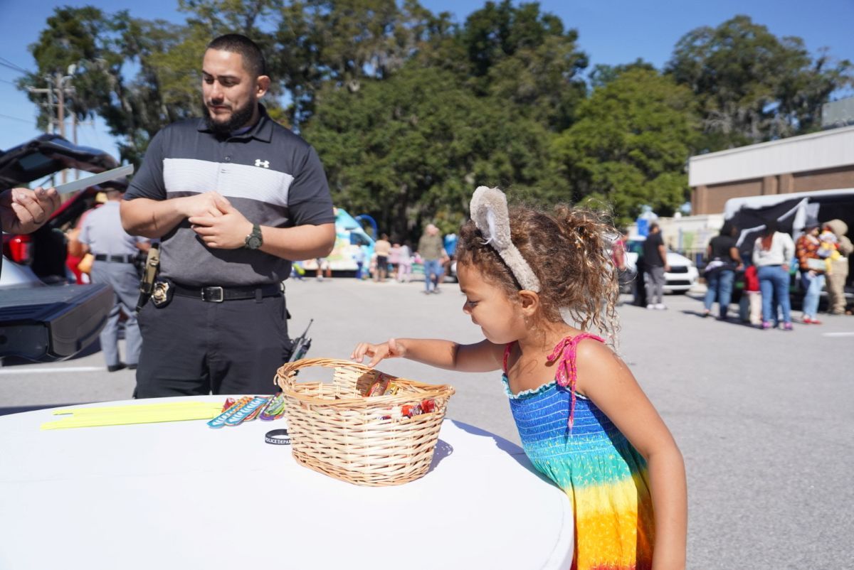 Beaufort’s Grace West, 5, chooses her treat during the Beaufort County Trunk Or Treat: Kids, Cops, Cars & Candy held at the Charles Lind Brown Center on Saturday, Oct. 25, 2025. Amber Hewitt/The Island News