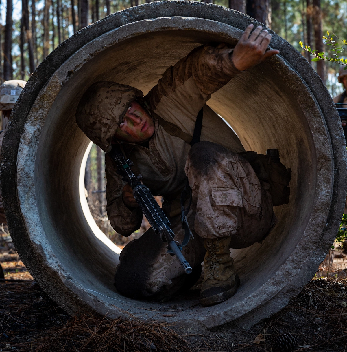 Recruits with Kilo Company, 3rd Recruit Training Battalion, complete the Crucible on Marine Corps Recruit Depot Parris Island on Thursday, March 21, 2024. The Crucible is a 54-hour culminating event in which the previous 11 weeks of training are put to the test. Pfc. Ayden Cassano/USMC