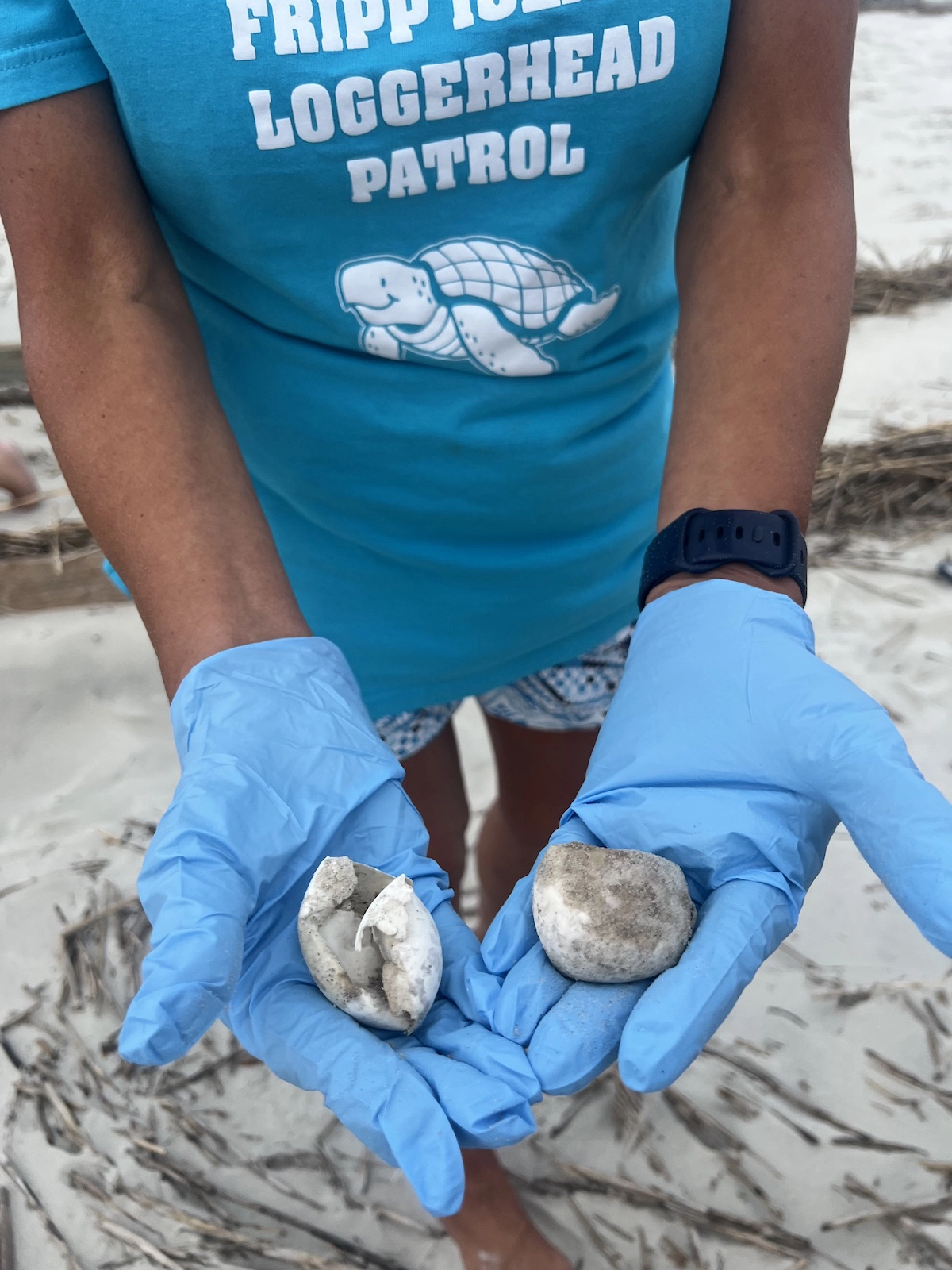 Hope Falls of The Island News caught these members of the Fripp Island Loggerhead Patrol – from left, Karen Natolli, Pebbles Turbeville, and Linda Lacabery – taking inventory of a turtle nest on Wednesday, Sept. 20. Mickey McGhee (shown holding hatched eggs) explains that nests are inventoried three days after the turtles hatch out. There were 111 eggs in this particular nest.