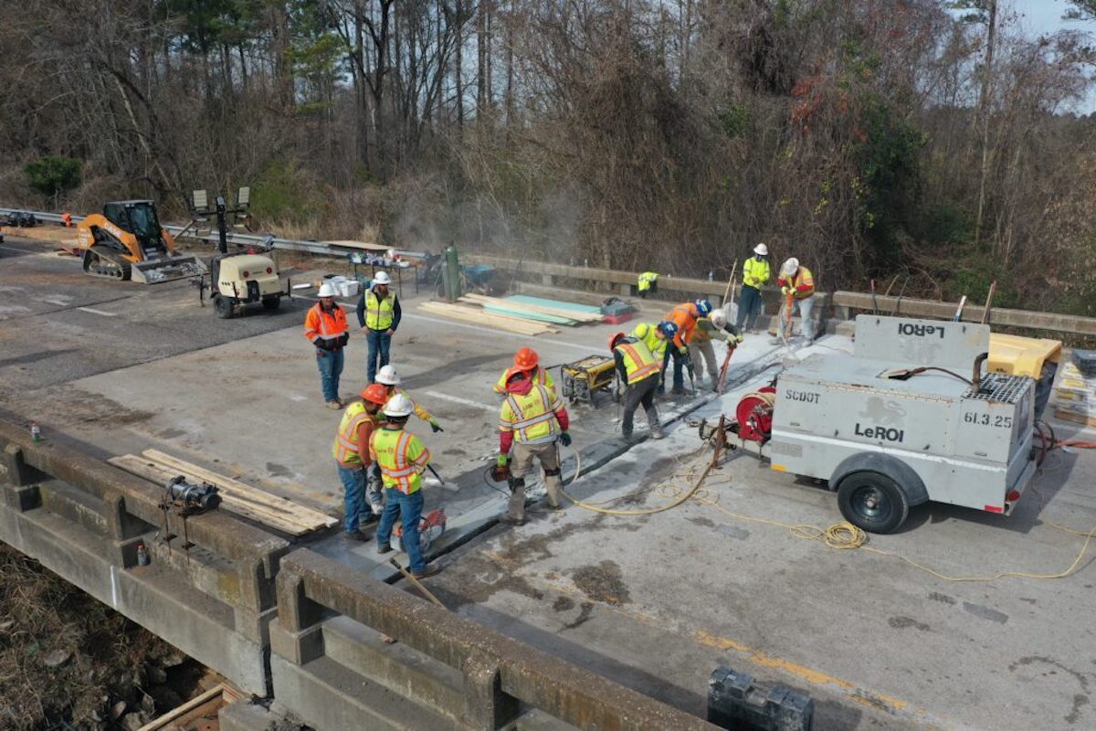 SCDOT and contractors work on emergency repairs on I-20 near the S.C. Department of Transportation employees and contractors work on emergency repairs on Interstate 20 near the Wateree River in Kershaw County on Dec. 22, 2023. The split in the rail on the right-hand side shows how the bridge had settled about three inches along the expansion joint. A steel beam custom made overnight and inserted underneath shored it up. Photo courtesy of SCDOT