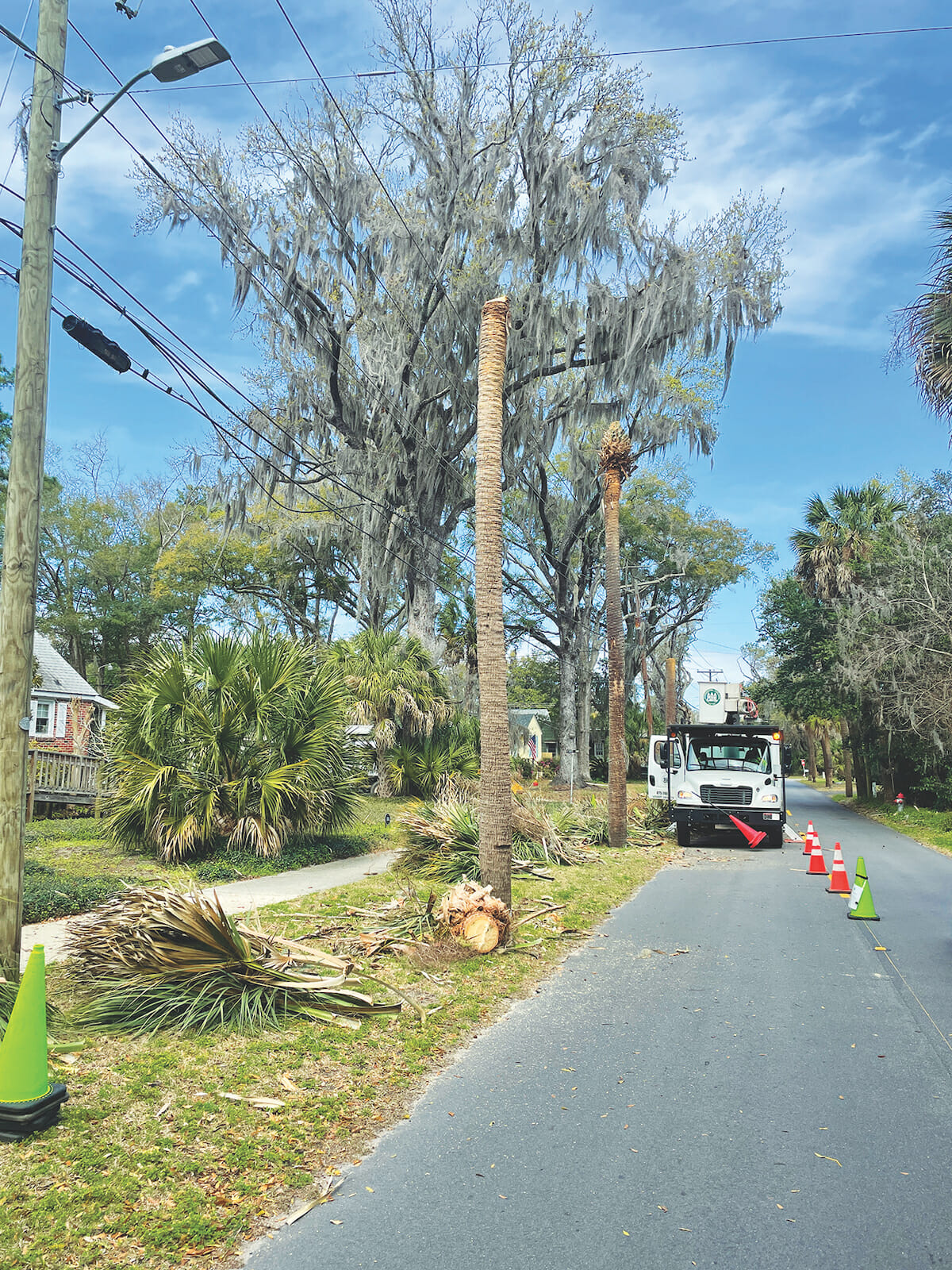 Palmetto trees were removed Monday along Pigeon Point Road by a crew from Gunnison Professional Tree Care. Victor Rojas, Gunnison’s crew supervisor, said the decisions of which specific trees were to be removed came directly from Dominion Energy. Photos by Jeff Evans.