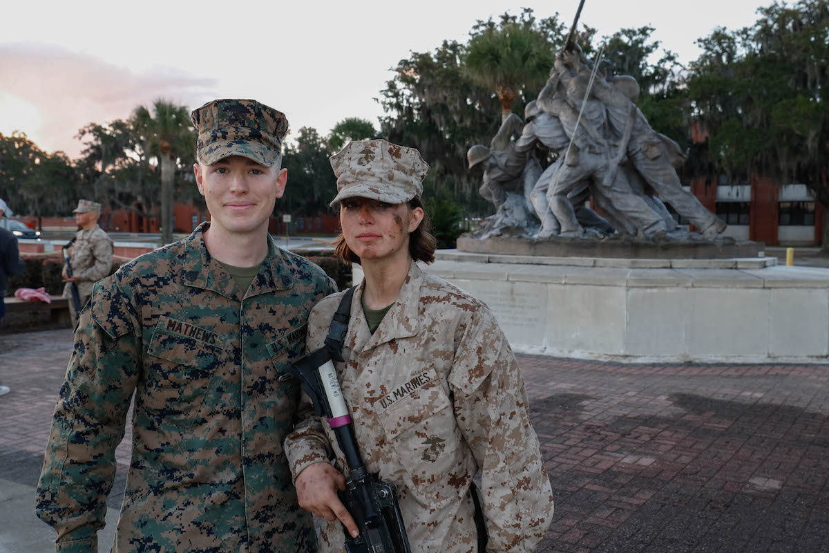 Pfc. Morgan Mathews was awarded her Eagle, Globe, and Anchor by her husband and recruiter SSgt. Charles Mathews on Dec. 9, 2023 at Marine Corps Recruit Depot Parris Island. The EGA ceremony is one of the most important events in any Marine’s life, and rarely is there an opportunity for a spouse to present a new Marine with the EGA. This moment was so emotional that neither could say a word. Lance Cpl. William Horsley/USMC