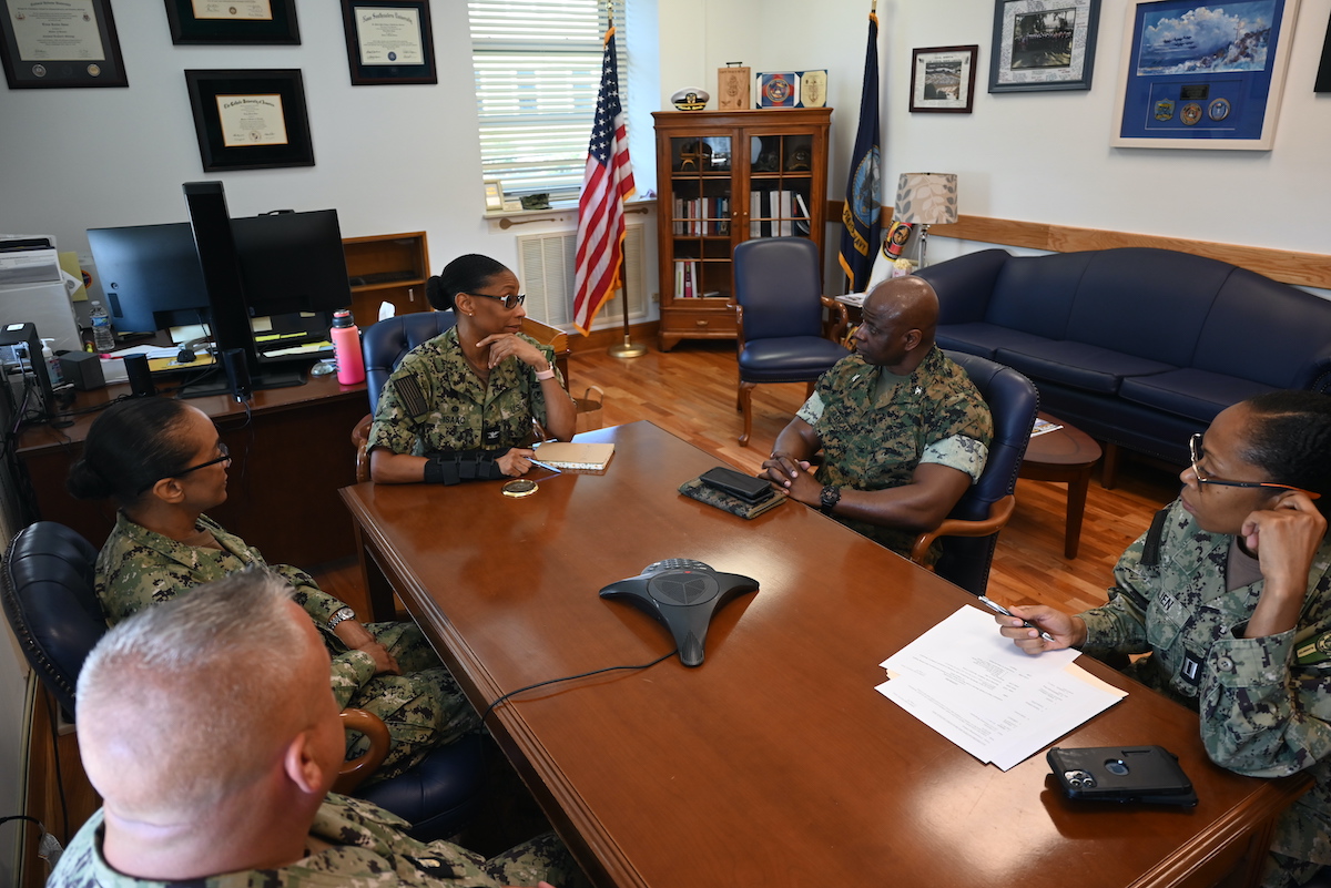 On August 12th, 2024, Col. Fred Glencamp of Marine Corps Recruit Depot (MCRD) Parris Island visited Navy Medicine Readiness and Training command (NMRTC), Naval Hospital Beaufort. He was guided around the hospital by Capt. Tracy Isaac, Capt. Cecilia Brown, and Command Master Chief Joesph Matthews. The leaders also sat down to discuss the resources that NMRTC Beaufort offers to support the Making of Marines mission at MCRD Parris Island. Lindsay Schreiber/Naval Hospital Beaufort