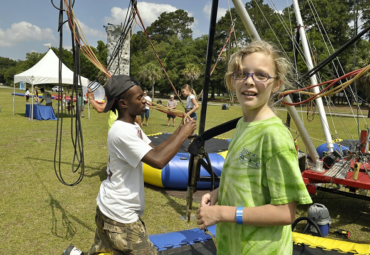 Lily Painton, right, gets all buckeled in while Lakim Womack double checks the bunji cords. Once everything was secure, Lily was able jump nearly 20 feet in the air.