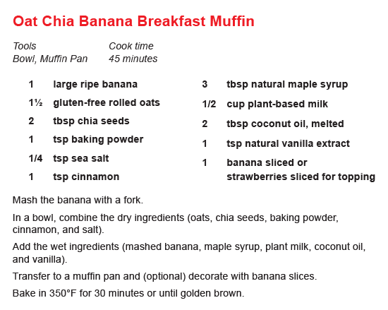Hearty ingredients like oats and banana help make these delicious muffins super satiating while chia seeds offer a boost of iron, omegas, and fiber. Healthy fats are represented by coconut oil and plant-based milk. A dash of cinnamon offers anti-inflammatory properties for a nutritious treat. Add some fresh berries or natural maple syrup, and you’ve got a subtle hit of sweetness that will satisfy your sugar cravings without going overboard.