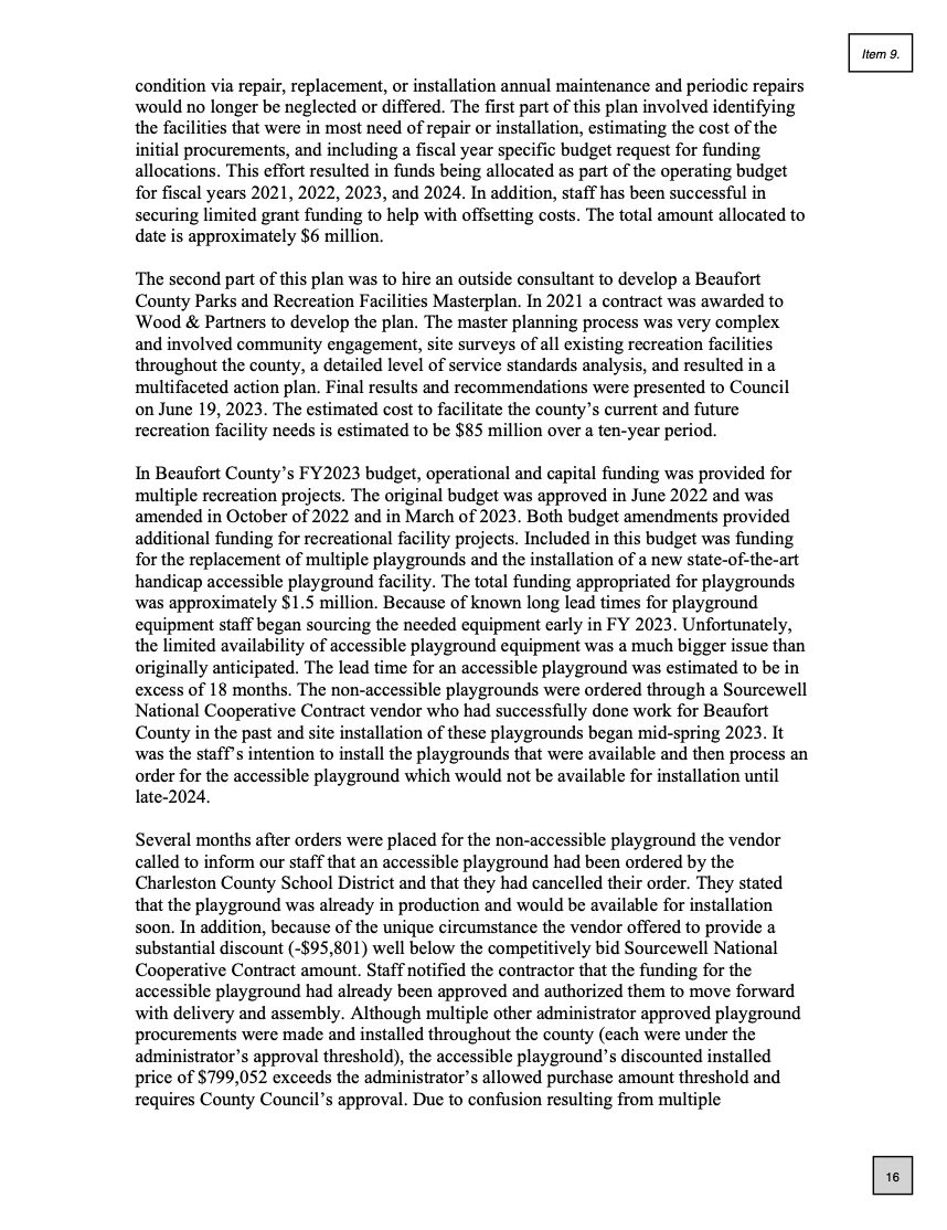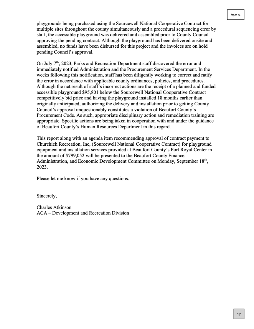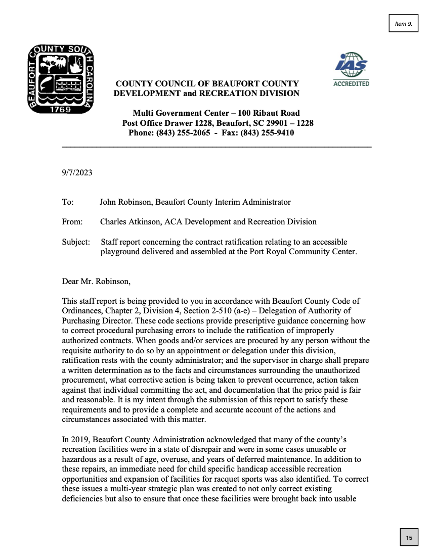 According to a letter from Atkinson to Beaufort County Interim Administrator John Robinson on Sept. 7, the error involving the inclusive playground was allegedly discovered by the Parks and Recreation staff on July 7, 2023, and they notified Administration and the Procurement Services Department, but the issue was not brought up to County Council for approval until Sept. 18.