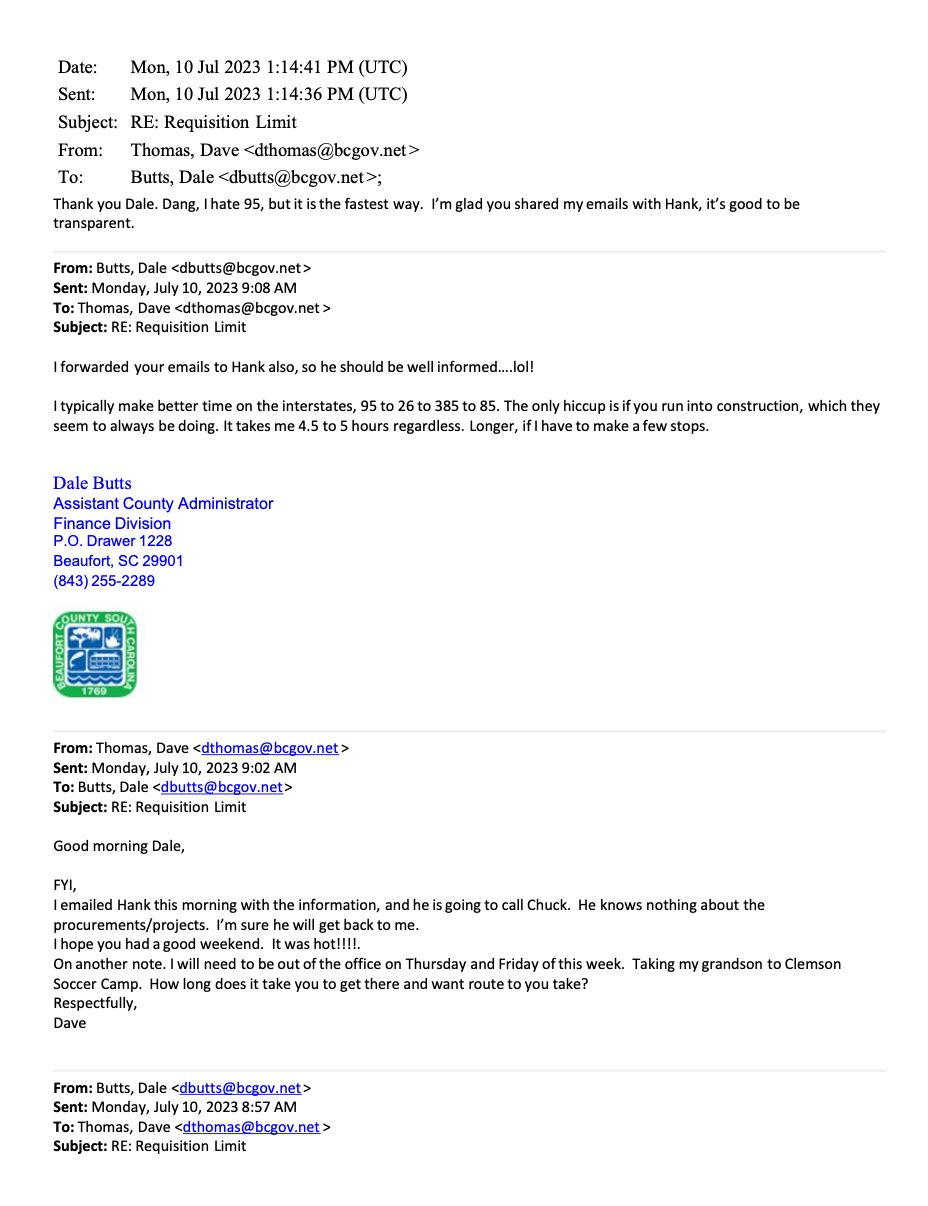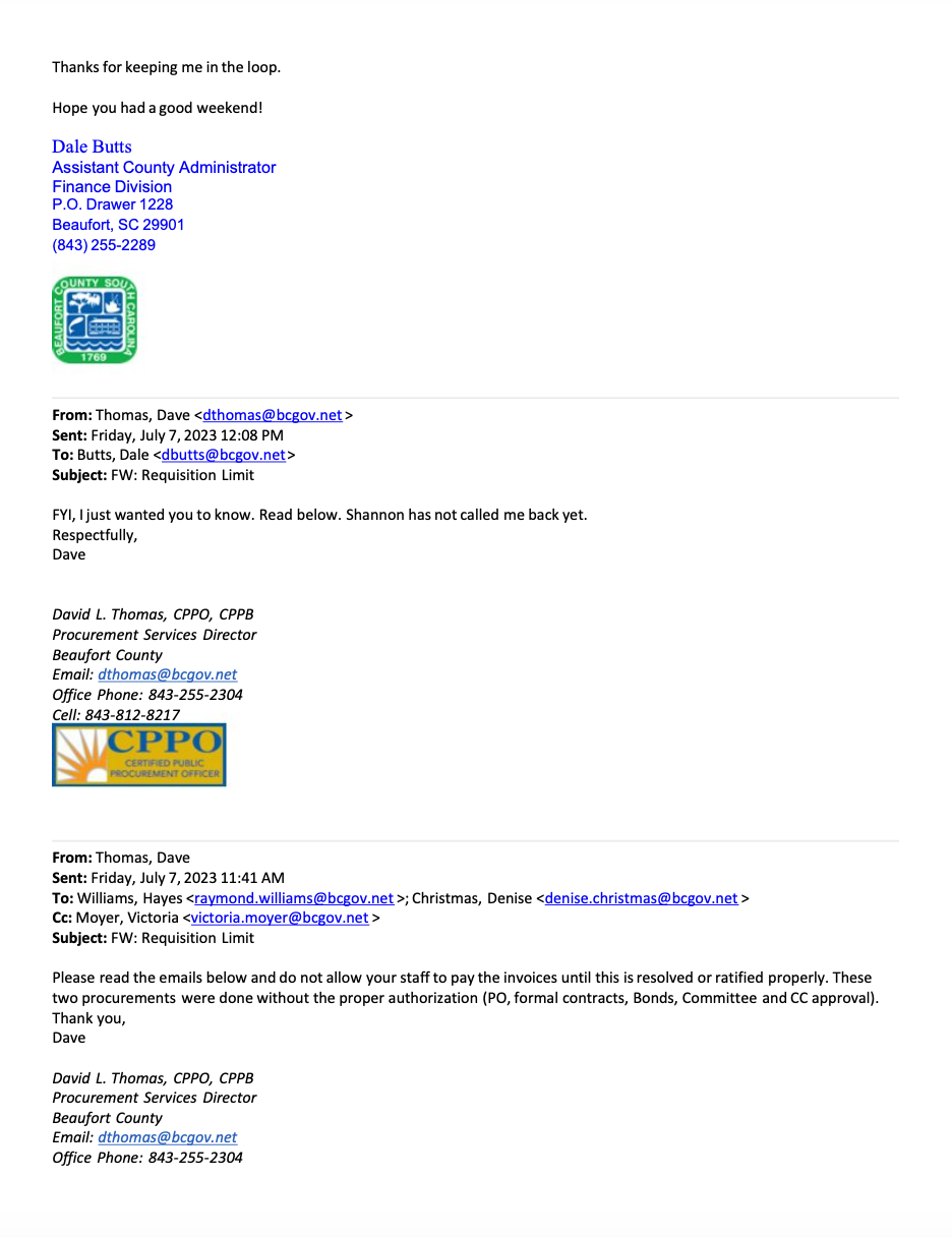 Per the emails, at some point between July 7 and July 10, Dale Butts, Assistant County Administrator with the Finance Division, and Dave Thomas, Procurement Services Director for Beaufort County, contacted Hank Amundson, Special Assistant to the County Administrator, who then contacted Atkinson.