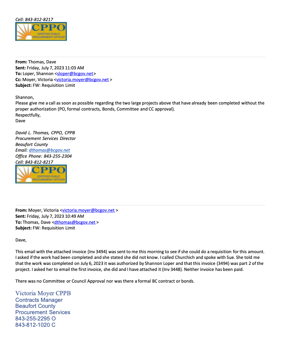 “Please give me a call as soon as possible regarding the two large projects … that have already been completed without proper authorization [purchase order], formal contracts, Bonds, Committee and [County Council] approval,” an email from Thomas to Loper on July 7 said.