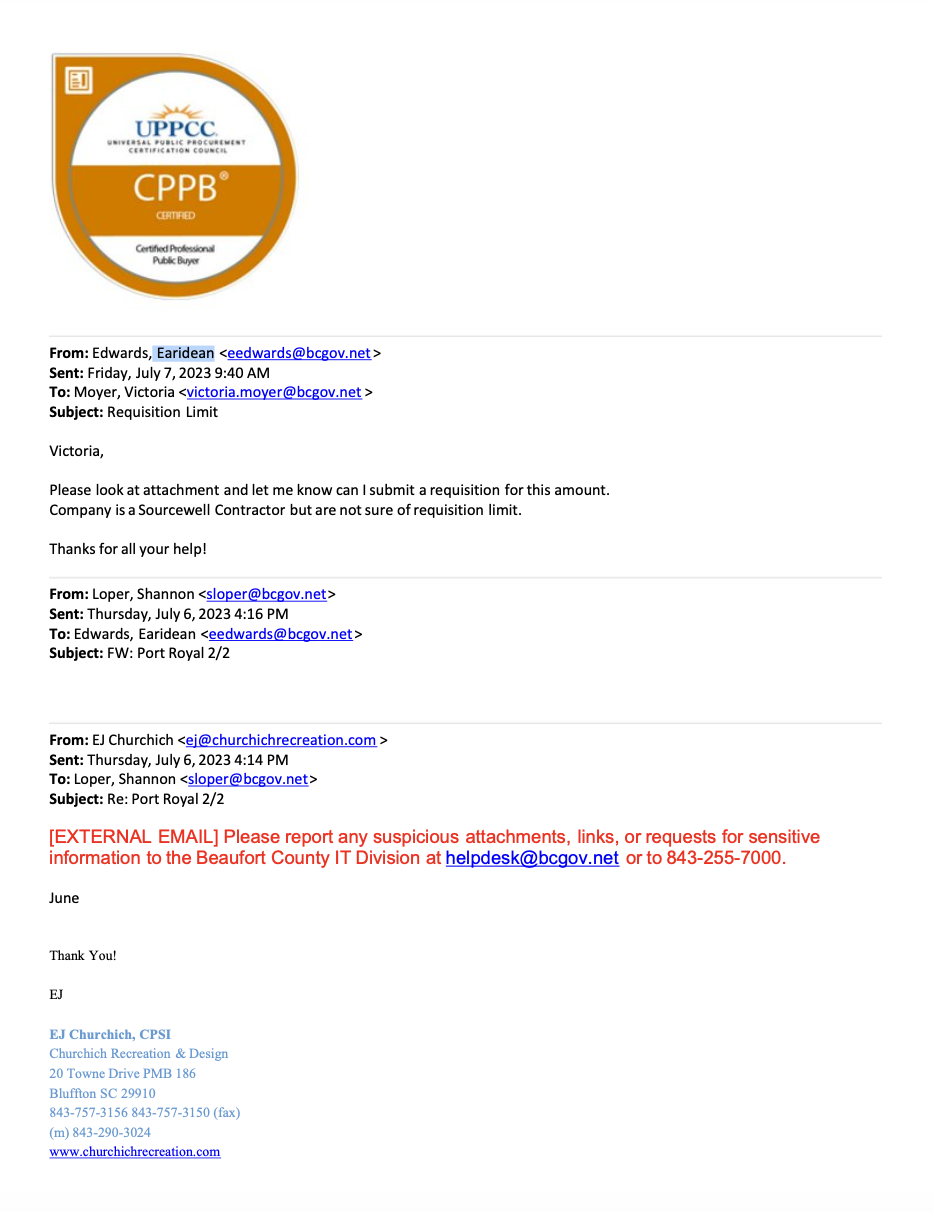 The email chain begins on July 7, 2023, one day after the work on the inclusive playground was completed, and the emails point to Victoria Moyer, the Contracts Manager with Beaufort County Procurement Services, as the person who discovered that the Parks and Recreation Department had not followed proper procurement code.