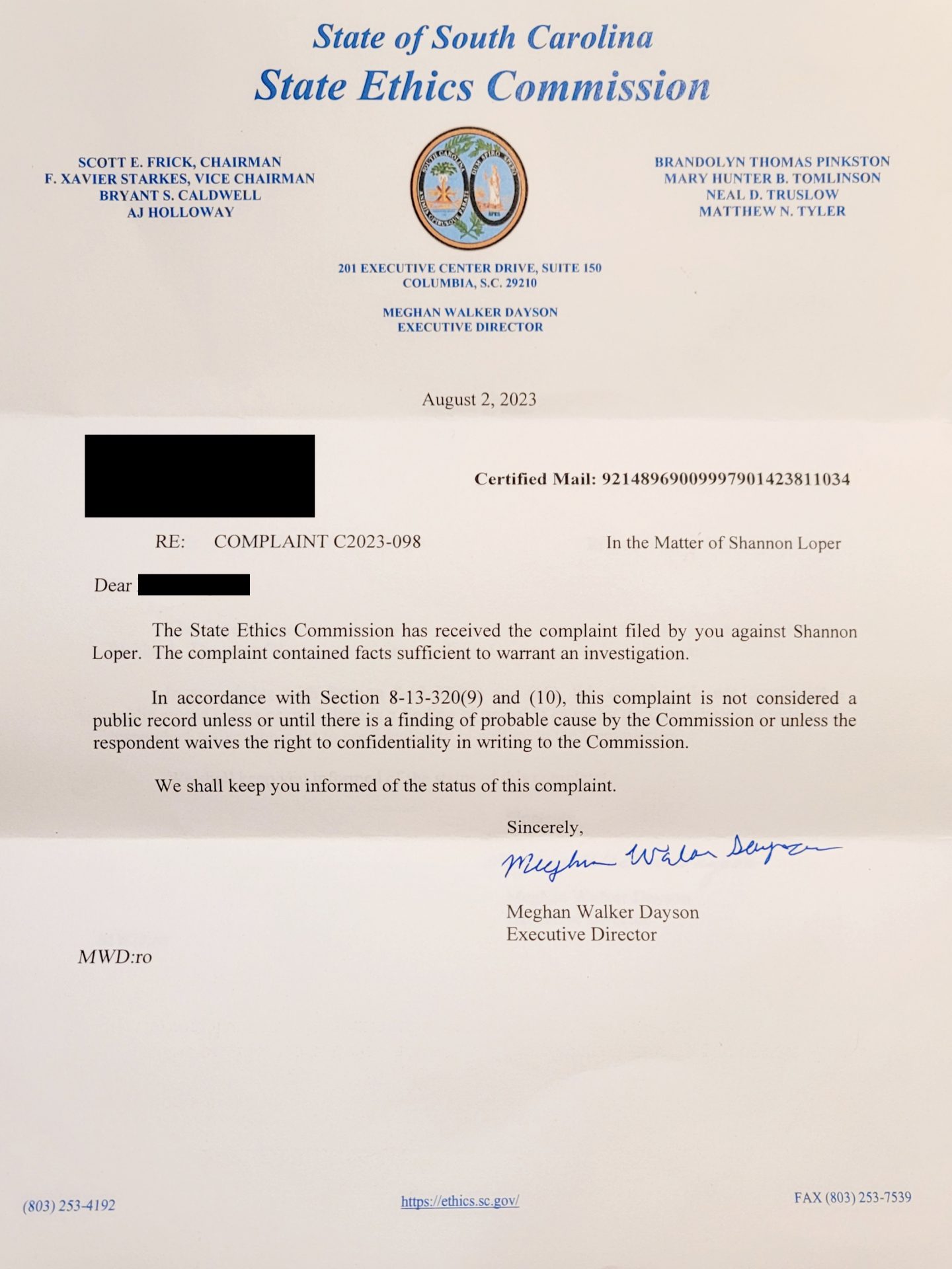In August 2023, the S.C. State Ethics Commission opened an investigation into Loper after it was determined that a complaint filed against her contained sufficient facts to warrant an investigation.