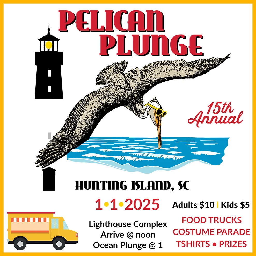 Fripp Island Sea Rescue will be on hand for safety, and 15th annual Pelican Plunge T-shirts will be on sale for all the participants and onlookers. With five food trucks, including a hot chocolate offering, organizers are ready to feed the hungry plungers.