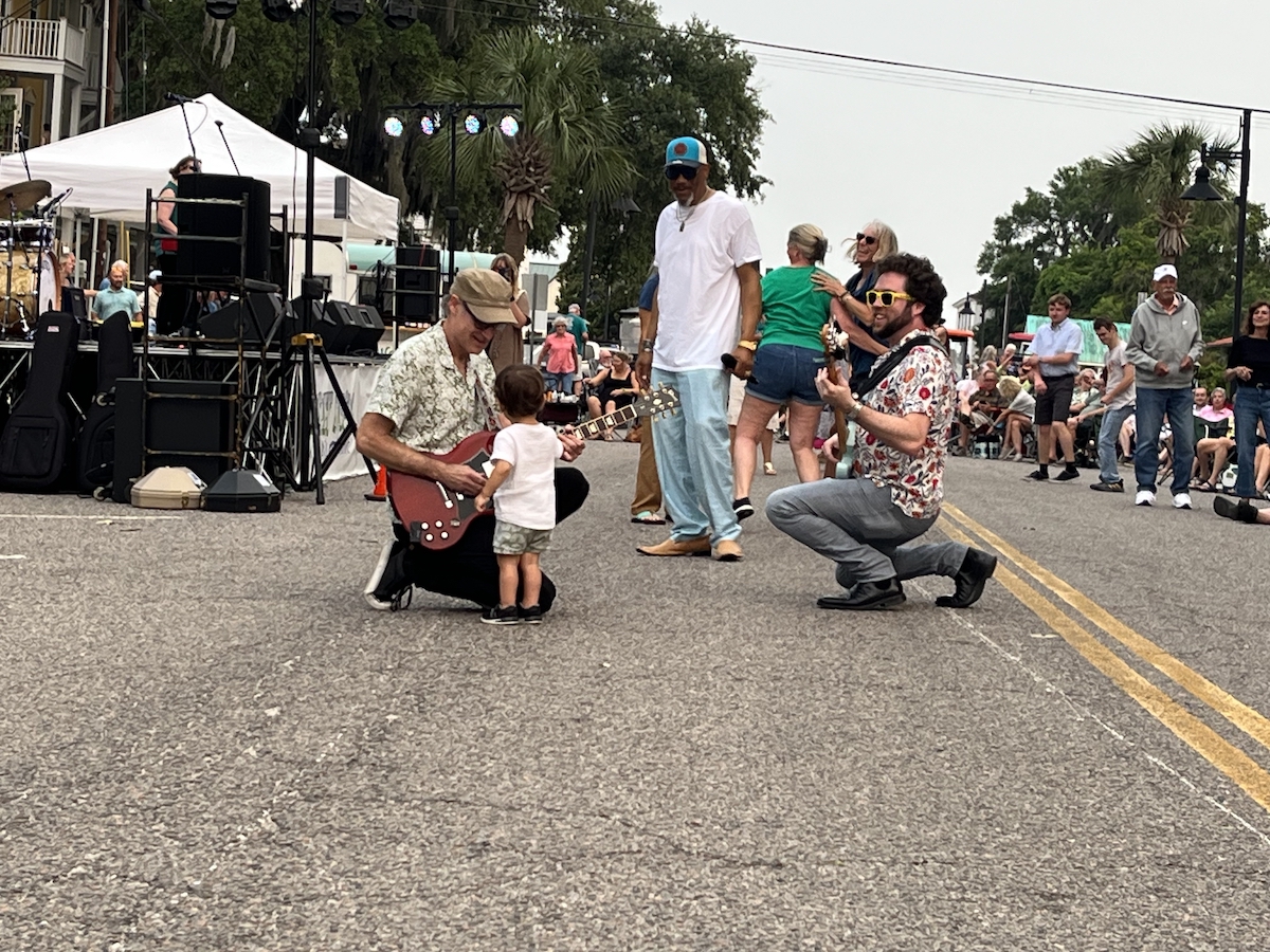 Seventeen-month-old Mateo Marroquin-Cadien of Beaufort scores better than a front-row seat as members of Piper & The Hard Times take to the street during their Saturday, May 31, 2025, performance at Port Royal’s Street Music on Paris Avenue. Linda Beattie/The Island News