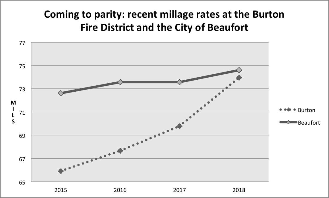 During the recent budget season something happened that has gone largely unnoticed because one part of the puzzle revealed itself in the Beaufort County Council’s chambers and the other came about in the council chambers in Beaufort’s City Hall. The Burton Fire District put their millage rate up 4.18 mils and the City of Beaufort raised theirs 1.02 mil so that on next year’s property tax bills the city’s millage rate will be 74.59 and Burton’s will be 73.97. This parity of rates (roughly six-tenths of a mil), coming for years but now arrived, changes the dynamic for the city’s growth into the Burton Fire District.