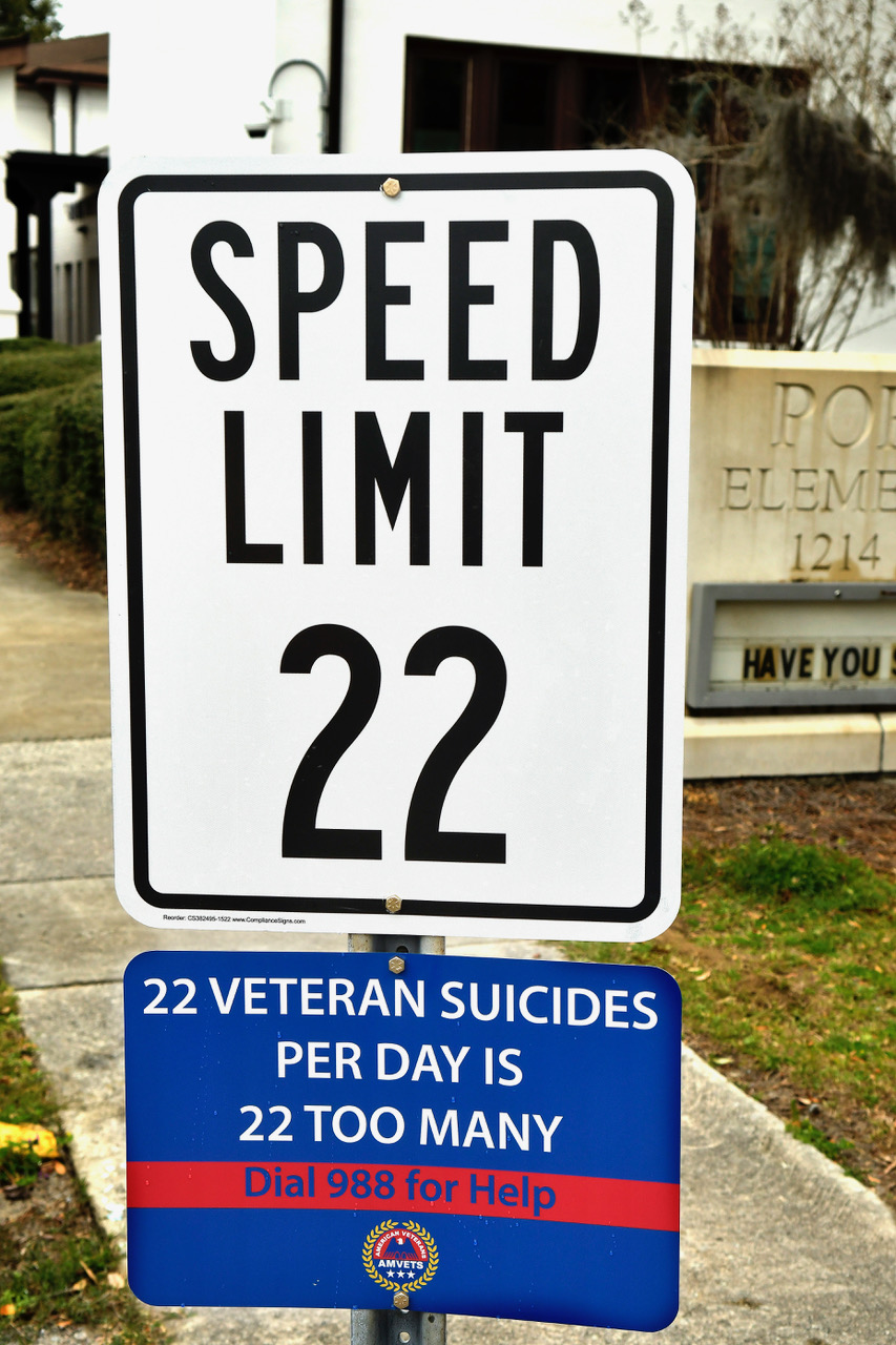 “22 veteran suicides per day is 22 too many,” is written on a sign below the speed limit sign.