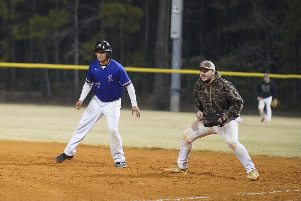 The Royals’ Ray Walker takes a lead off first base Wednesday night, Jan. 15, 2025, during the Beaufort County Adult Men’s Baseball League Fall Championship at Burton Wells Recreation Center. The Red Snappers beat the Royals, 11-10, to win the championship. Amber Hewitt/The Island News
