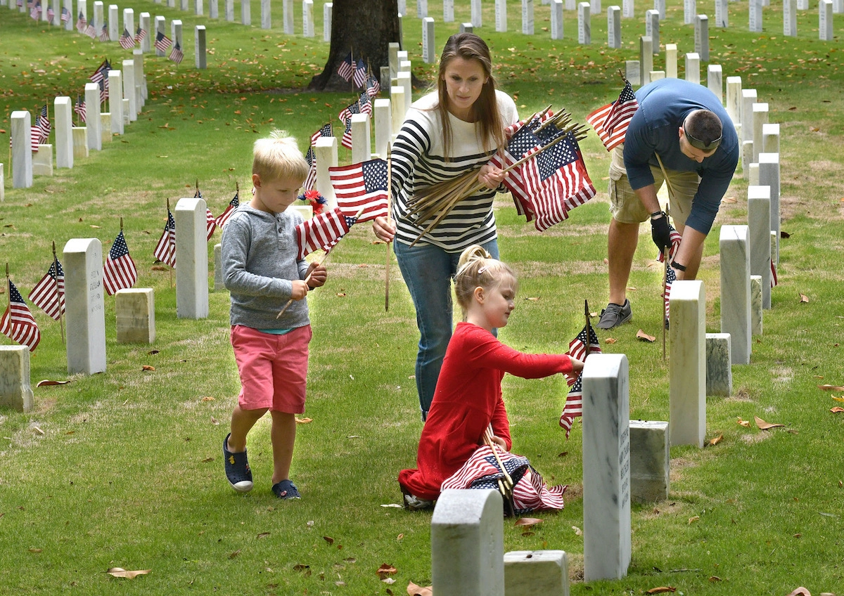 The Schanwecker family, Andrew and Lindsay with MacKensie, 7 and Bennett, 5, put out mini American Flags at the headstones Friday, May 26, in preparation for annual observance of Memorial Day. The Schanweckers said they homeschool their children and incorporated a civics lesson while giving back to the community by placing the flags. Bob Sofaly/The Island News