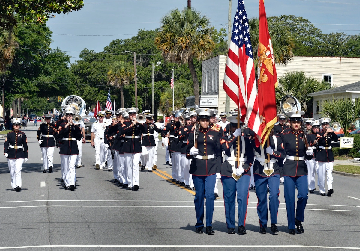 The Marine Corps Color Guard – Lance Cpl. Sharlen Hernandez, Sgt. Latoya Silva, Cpl. Mercedes Nava-Escalona and Lance Cpl. Rayssa Deoliveira – followed by the Parris Island Marine Band, takes the traditional lead of the annual Memorial Day Parade on Monday down Boundary Street. Bob Sofaly/The Island News