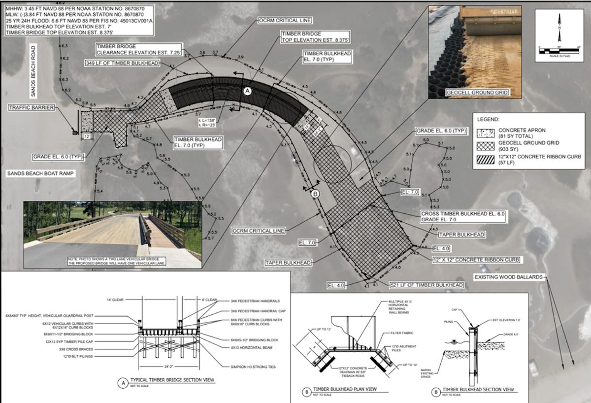 To address the problem, the town is constructing a 150- to 200-foot-long timber bridge that will rise and fall to accommodate tides and provide a safe walkway for both pedestrians and vehicles.