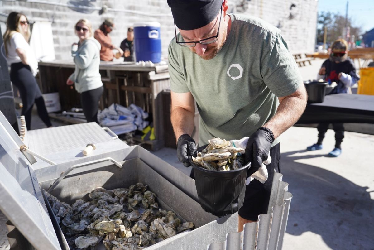 Chef Eric prepares a bucket of freshly steamed oysters during the annual New Year’s Day Oyster Roast at Shellring Ale Works on Wednesday, Jan. 1, 2026. Amber Hewitt/The Island News