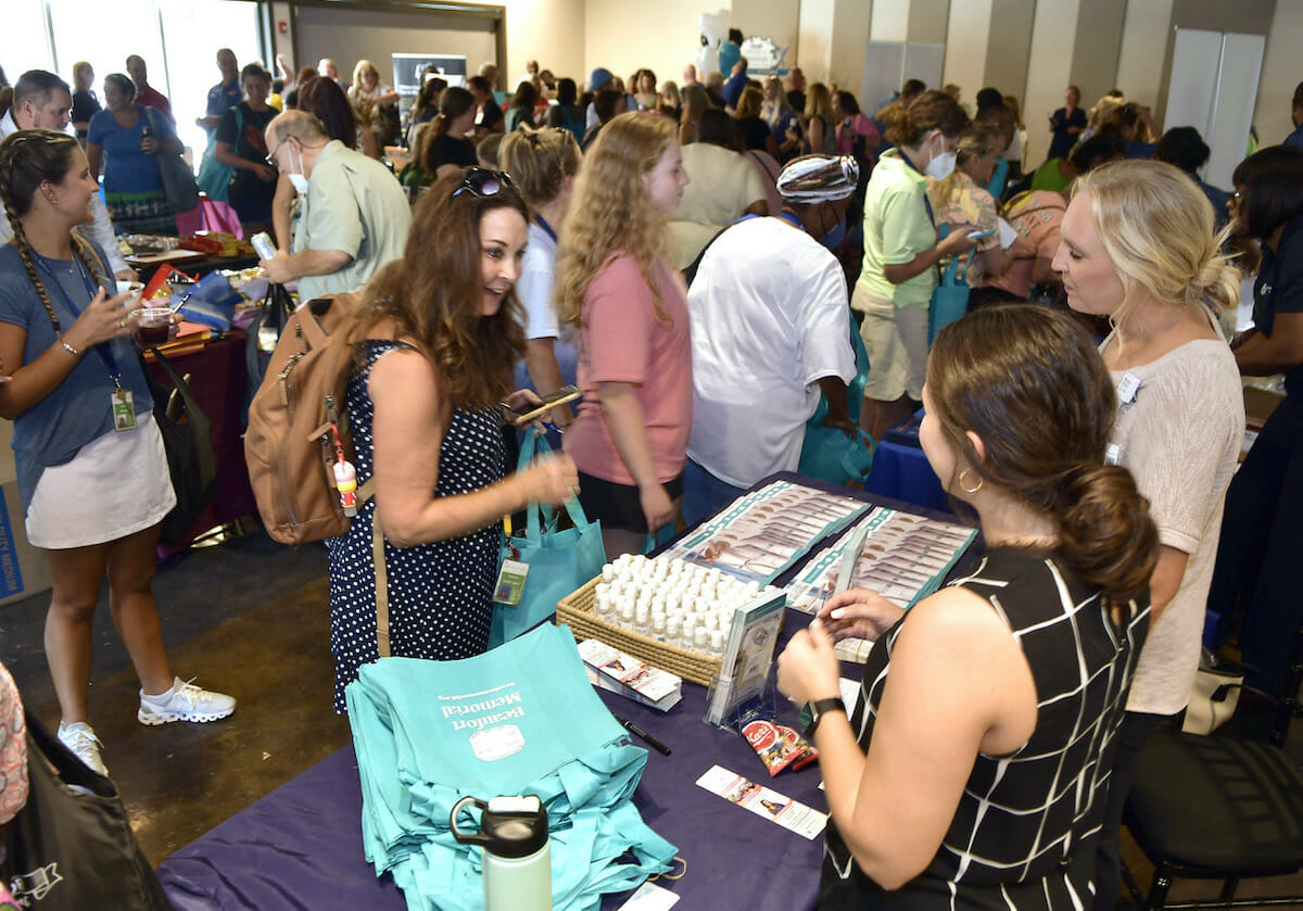 Victoria Viventi, lower right, of Beaufort Memorial Hospital gives away free stuff to local teachers during the inaugural Educator Appreciation event hosted by The Beaufort Regional Chamber of Commerce on Tuesday at Tabby Place. Photo by Bob Sofaly.