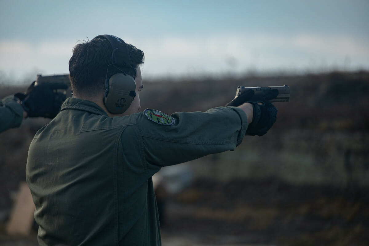 Above at left: U.S. Marine Corps Lance Cpl. Aaron Gentz, team member, special reaction team (SRT), Provost Marshal’s Office, Marine Corps Air Station Beaufort, fires a Sig Sauer M16 pistol Tuesday, Jan. 10, during a moving drill at MCRD Parris Island. Above at right: U.S. Marine Corps Sgt. Efrain Arroyo, team commander, special reaction team (SRT), Provost Marshal’s Office, Marine Corps Air Station Beaufort, fires a Sig Sauer M16 pistol Tuesday, Jan. 10, to remain tactically proficient at Marine Corps Recruit Depot Parris Island. The SRT is comprised of military police personnel trained to give an installation commander the ability to counter a threat situation surpassing normal law enforcement capabilities. SRT must be capable of isolating a crisis scene, providing proficient marksmanship support, conducting tactical movement and building entry, and clearing buildings. Photos by Sgt. Cheyeanne Campbell/USMC
