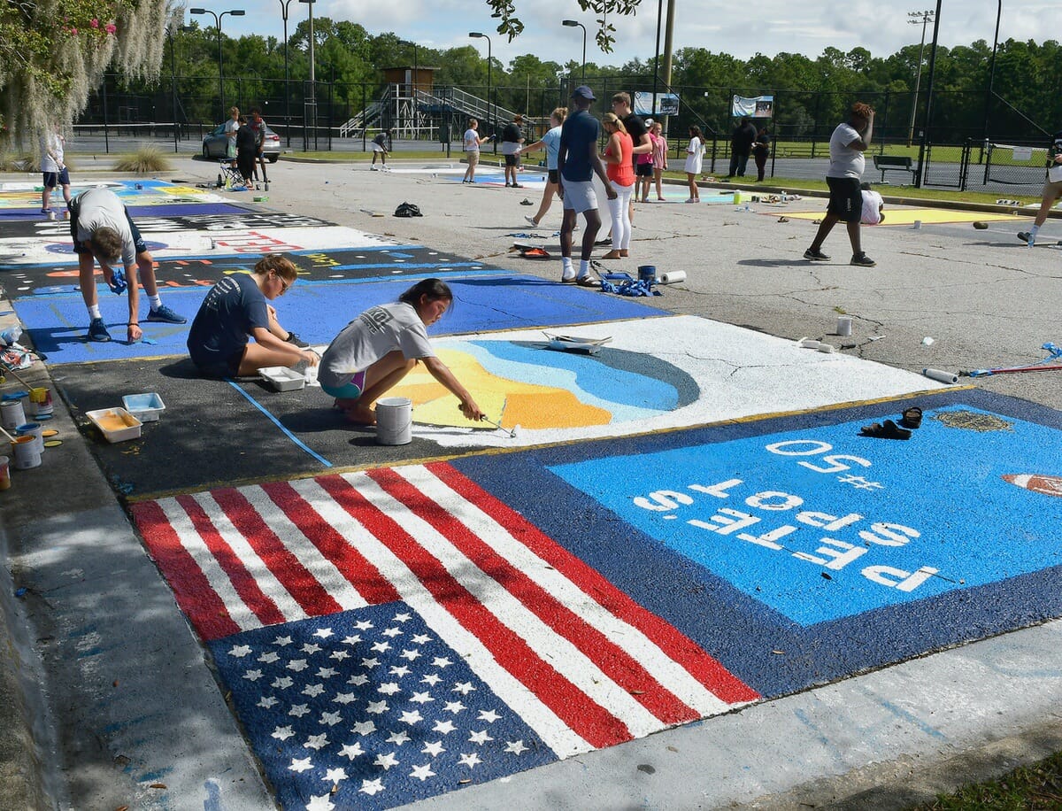 Bottom photo: Seniors at Beaufort Academy got to paint their own parking spaces on Thursday, Aug. 13. Here, Maeve Kaladay, June Ward and Connor Aivaz put the finishing touches on their parking spots as their school reopened for in-person lessons.