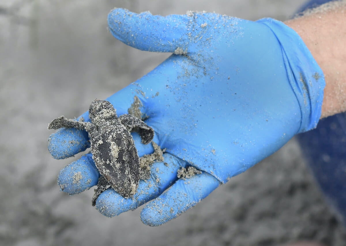 That’s because Glass was now standing, her arm no longer buried in the beach. And in her blue latex glove-laden hand she was holding the lone live hatchling that had remained in nest No. 100.