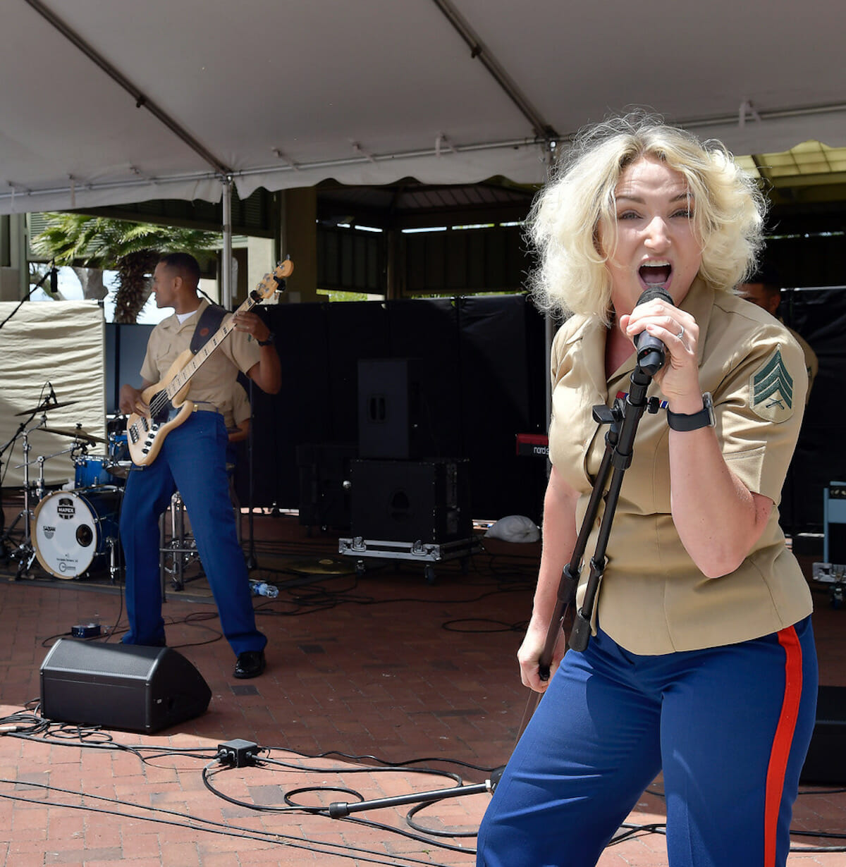 Sgt. Dana Rominsky of the Parris Island Marine Corps Rock Band belts out a song while bassist Lance Cpl. Andre Phanor, far left, gets his groove on during the annual Taste of Beaufort on Saturday at Henry C. Chambers Waterfront Park. Just out of camera range are Gunnery Sgt. Andres’ Trujillo on lead guitar; Lance Cpl. Blaine Mitchell on drums and Lance Cpl. Austin Plumer.
