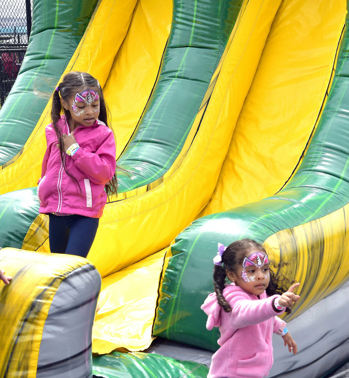 Two little girls seem to form a mirror image of each other as they decide to go to another “inflatable” during the annual Helicopter Easter Egg Drop.
