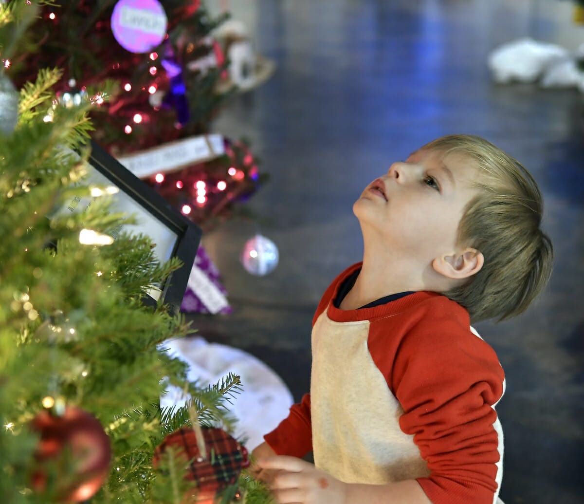 Three-year-old Luke Johnson looks at the top of one of the more than 60 Christmas trees on display at Tabby Place on Wednesday, Dec. 5, during the annual Festival of Trees fundraiser.