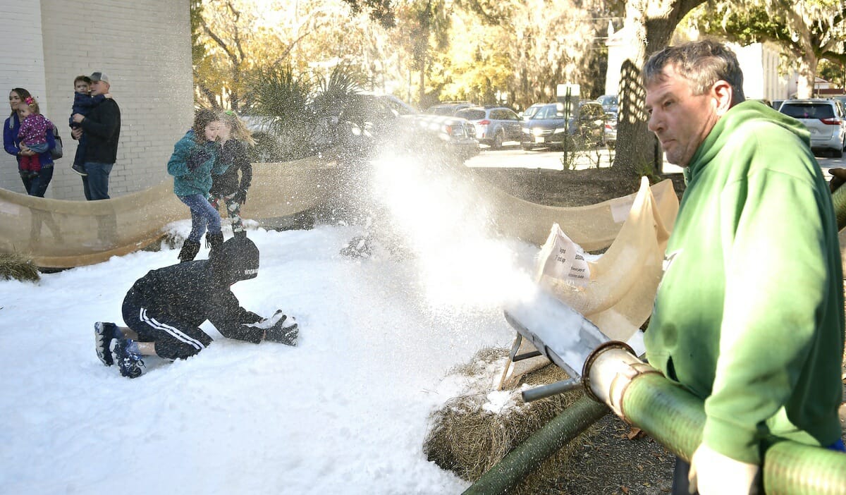 Scott Monson of Triangle Ice of Savannah sprays out some of the 10 tons of ice needed to create a snow day for children to play in at Tabby Place on Wednesday, Dec. 5, during the annual Festival of Trees fundraiser for Friends of Caroline Hospice. Photos by Bob Sofaly.