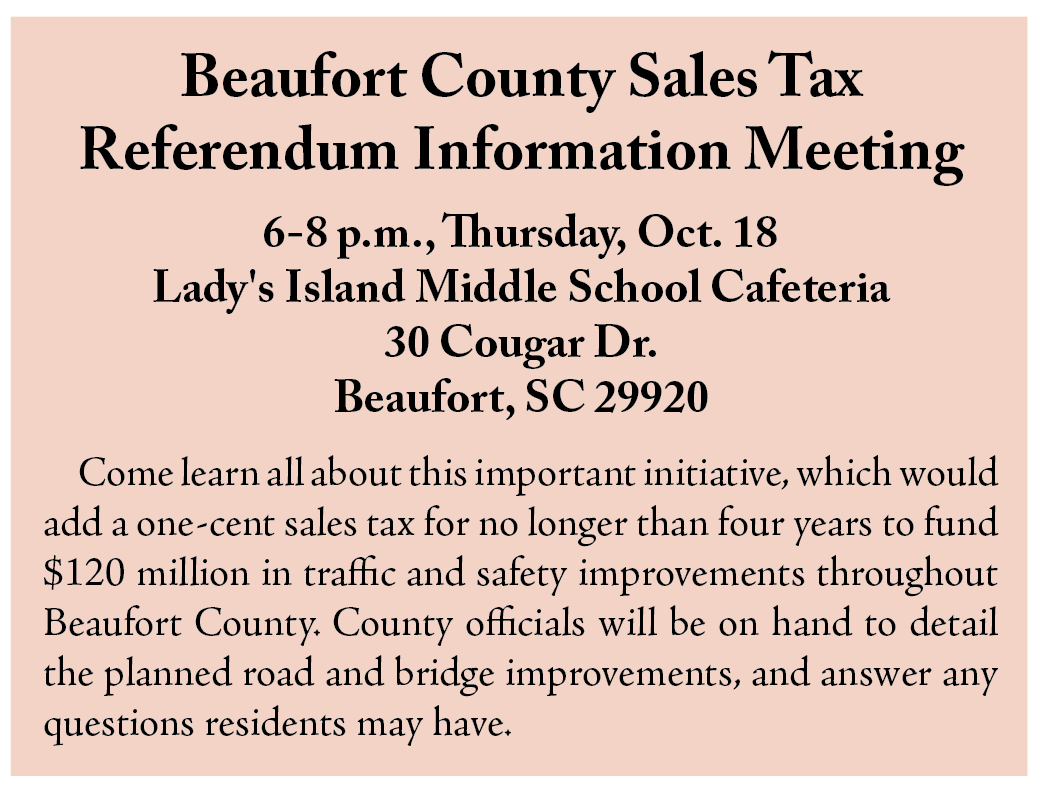 Beaufort County is hosting a Public Informational Meeting about the upcoming 1-cent sales tax which will be on the November ballot. It will be held from 6-8 p.m. on Thursday, Oct. 18, in the Lady’s Island Middle School cafeteria. For Northern Beaufort County, this ties into the Lady’s Island Plan 2018, along with some sidewalk/multi-use path improvements around the northern portion of the county.