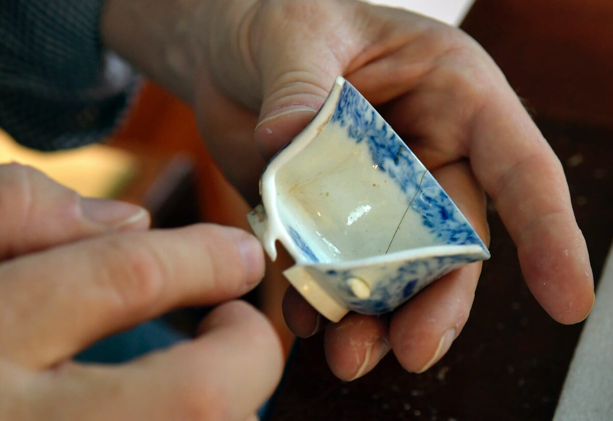 Wallace Scarborough repairs a broken tea cup, the pieces of which were unearthed in the 230-year-old privy recently excavated.