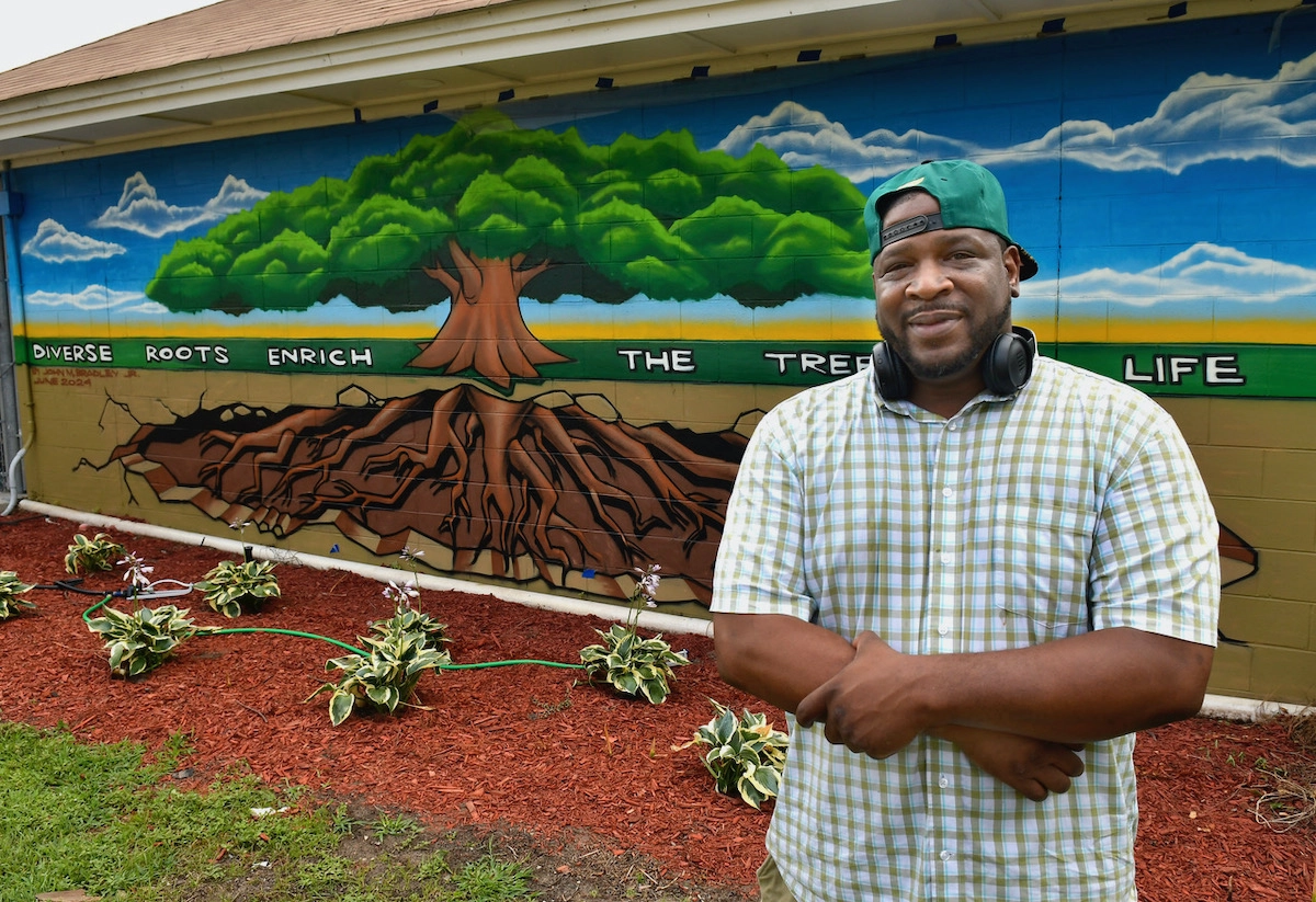 Mural artist John Bradley, Jr., poses for a photo in front of his newest creation during the inaugural Unity in the Community event Saturday, June 22, at Alvin Settles Pool, adjacent to the Charles “Lind” Brown Community Center on Greene Street in Beaufort. Bob Sofaly/The Island News