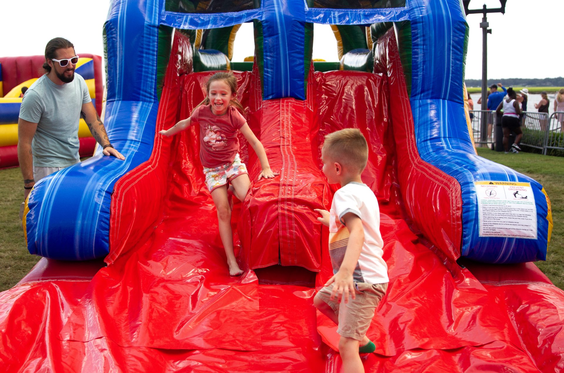 Lilah Kish, 6, left, and her brother Oliver, 4, both of Jasper, Ga., slide down an inflatable slide as their father, Mike White, watches during Children’s Day on Sunday, July 16, 2023, during the 67th Annual Beaufort Water Festival at Henry C. Chambers Waterfront Park in Beaufort. Delayna Earley/The Island News