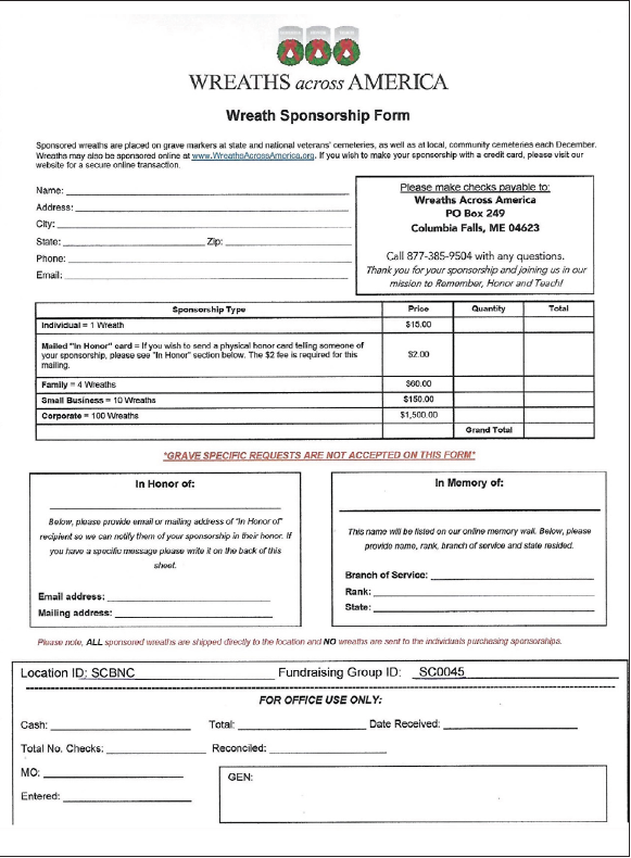 Orders for wreaths must be received by Wreaths Across America no later than November 30. The address is on the attached form.