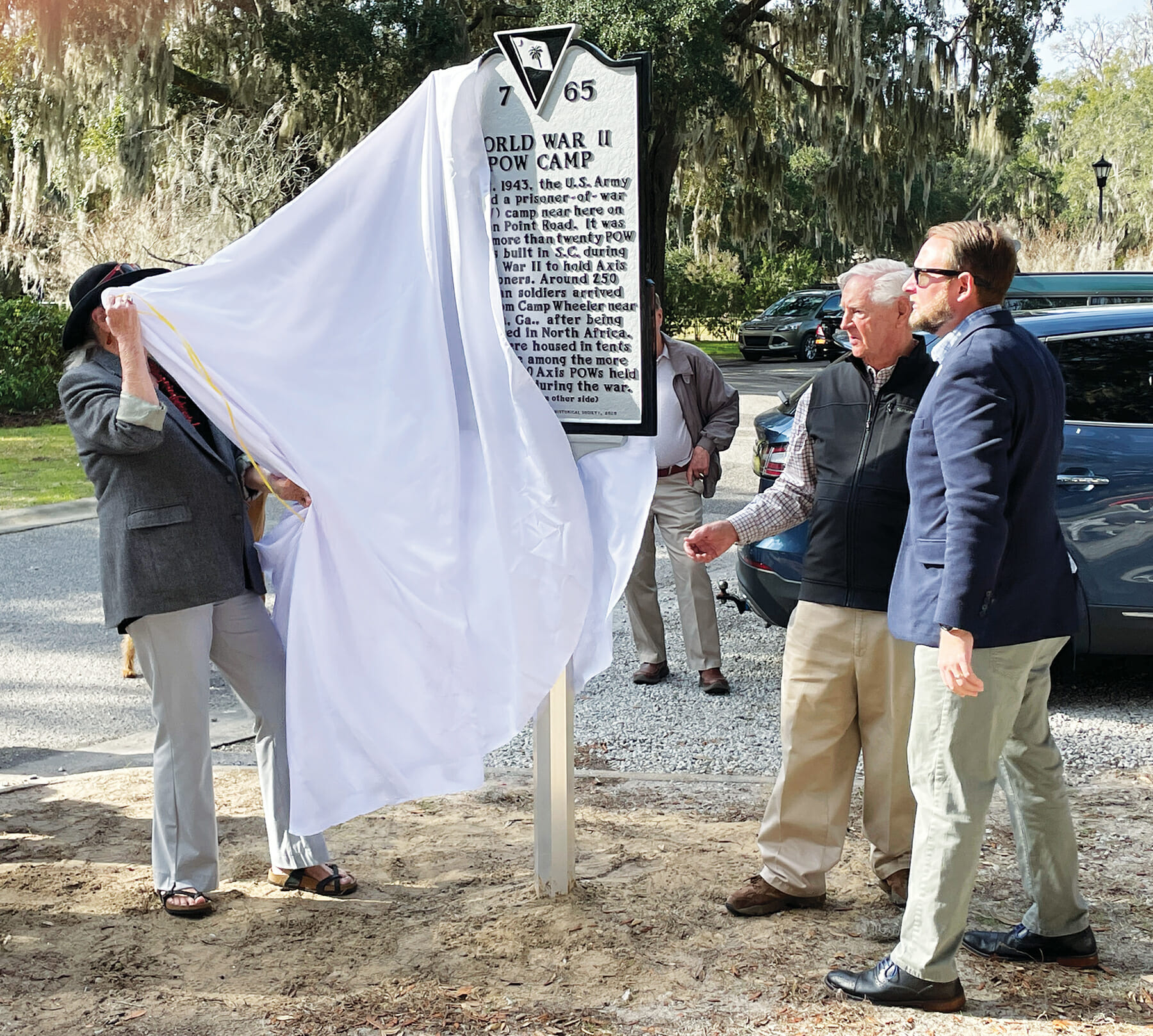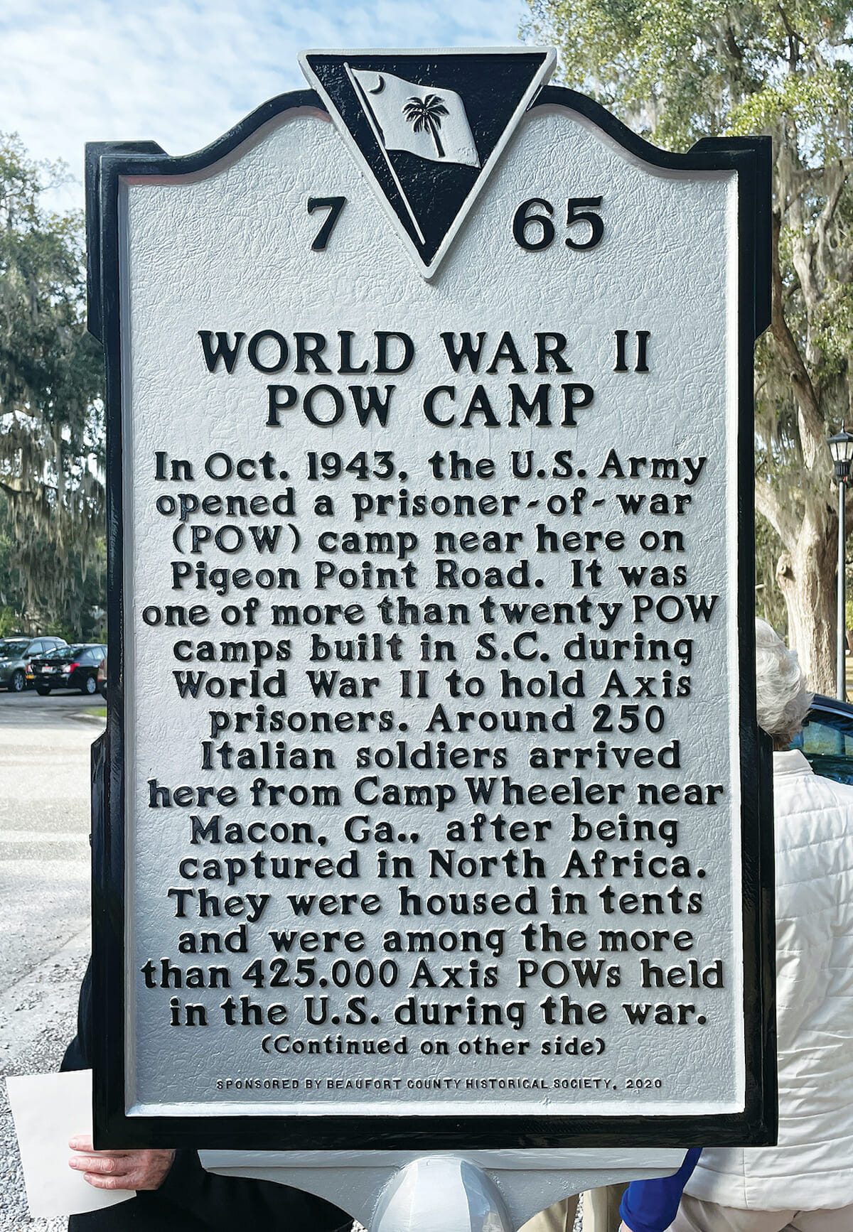 About 100 people gathered at Pigeon Point Park Thursday morning for the Beaufort County Historical Society’s unveiling of a new marker commemorating the prisoner of war camp that stood near that spot during WWII.