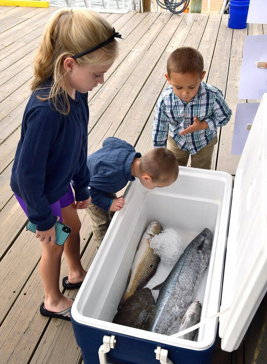 While waiting for their dad to come in and weigh his fish, Emmalyn Heath,8, and her brothers Lawson, 4 and Jax, 2, check out some of the other fish that have been weighed during the Youth Fishing Tournament weigh-in Saturday (10/3) at the Beaufort Yacht and Sailing Club. Both boys marveled over how big the teeth of the king mackerel were.